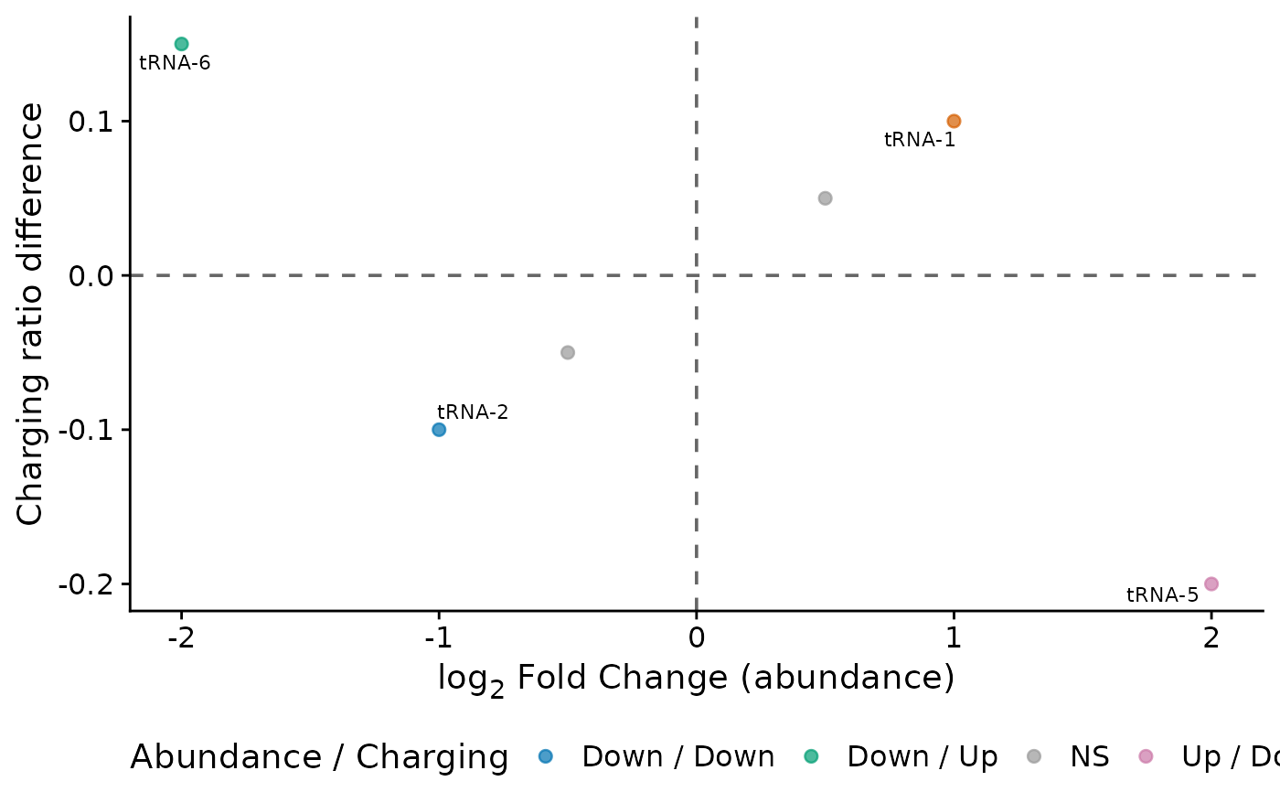 Creates a scatter plot comparing tRNA abundance changes (from DESeq2) with charging ratio changes on a single plot. Significant points are colored by quadrant and labeled with ggrepel::geom_text_repel().